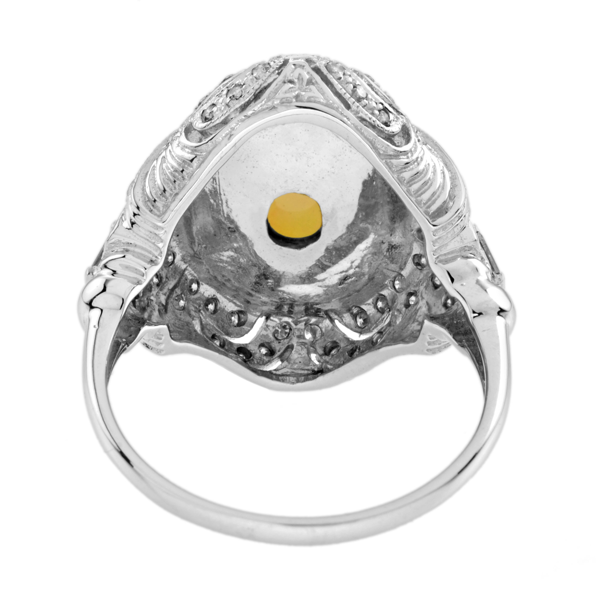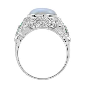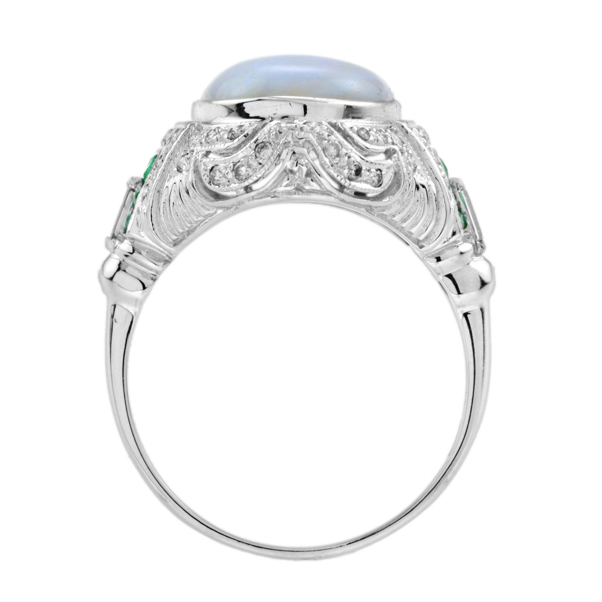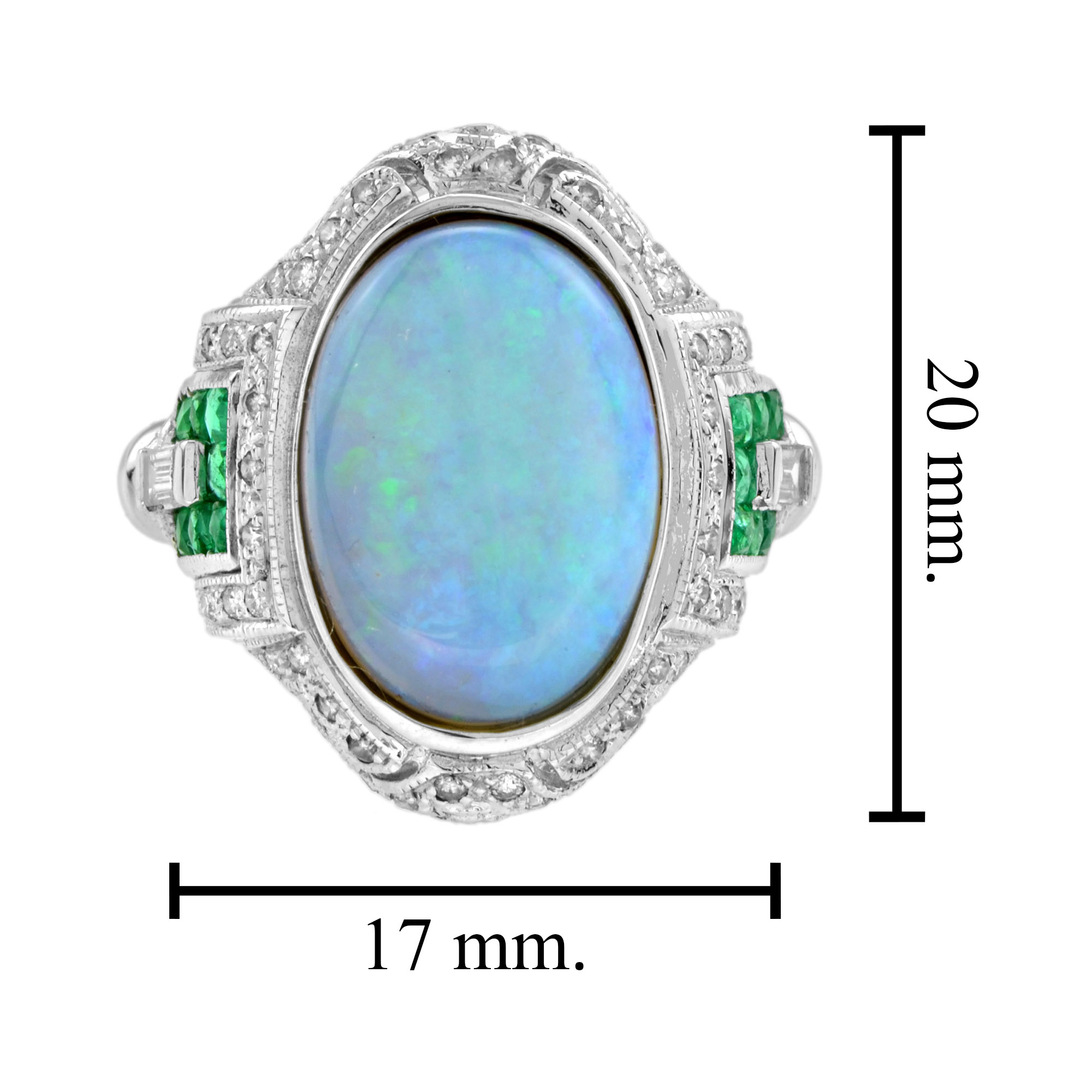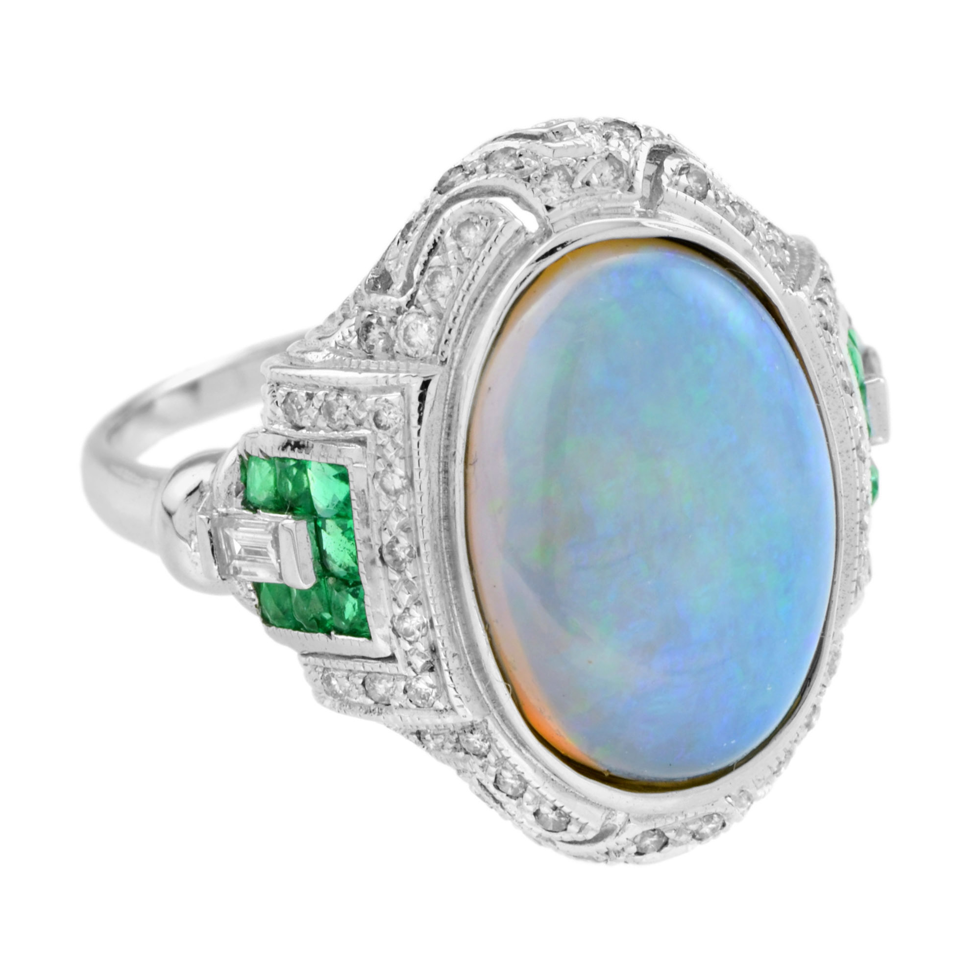 This Art Deco style opal ring features a stunning 3.75 oval shaped cabochon opal with French cut emerald and diamond on either side set in 14k white gold. This ring will an outstanding look.