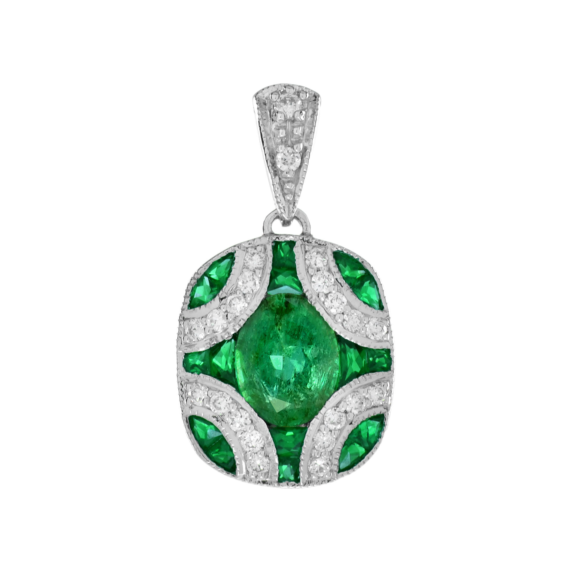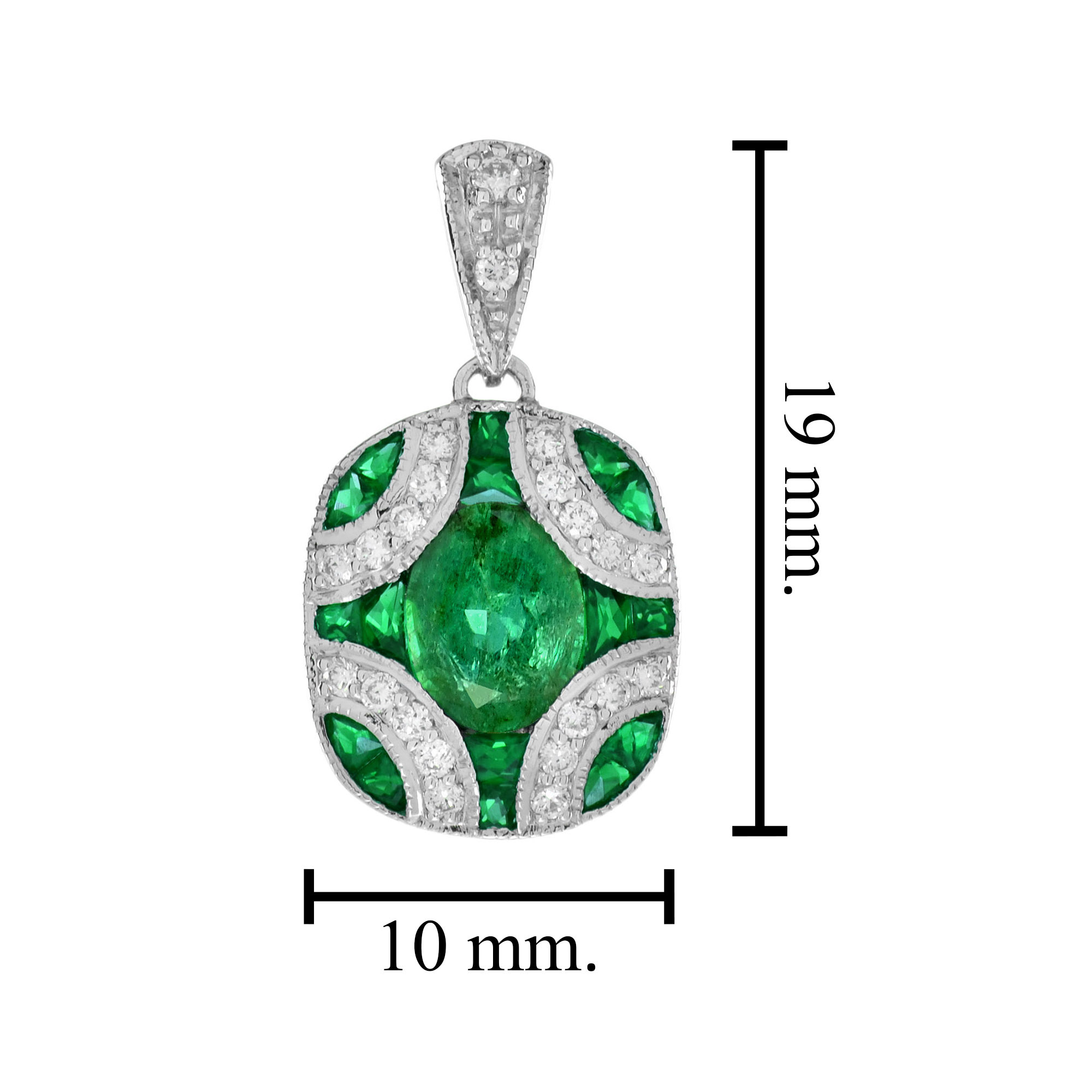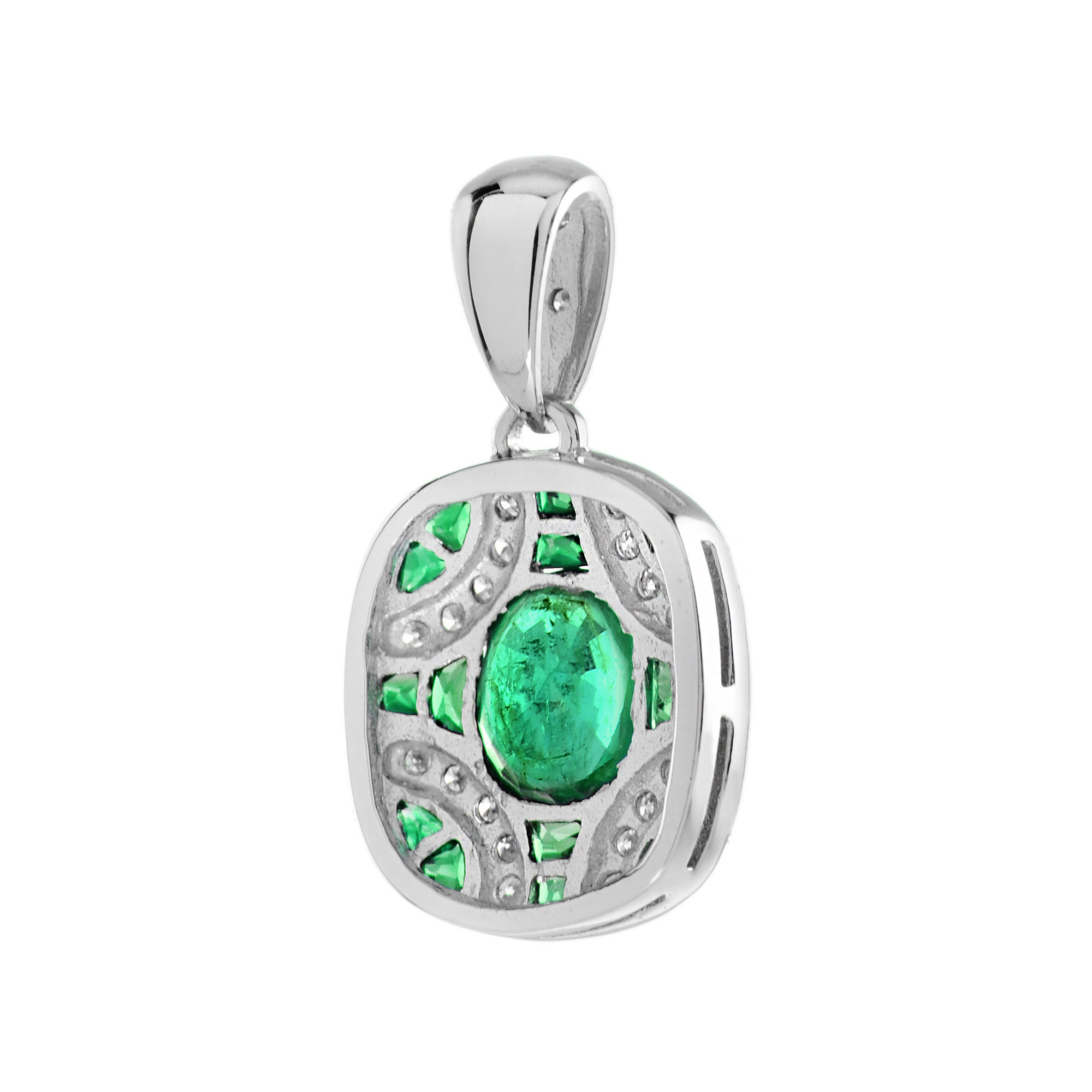 An attractive Art Deco style emerald and diamond pendant in milgrain setting centered by an approximately 0.5 carat oval cut emerald adorned by additional French cut emerald flanked by round brilliant diamond line on each corner. This pendant necklace, crafted in solid white gold, is perfect for those who appreciate antique and artistic jewelry. Perfectly matched with the same design ring.