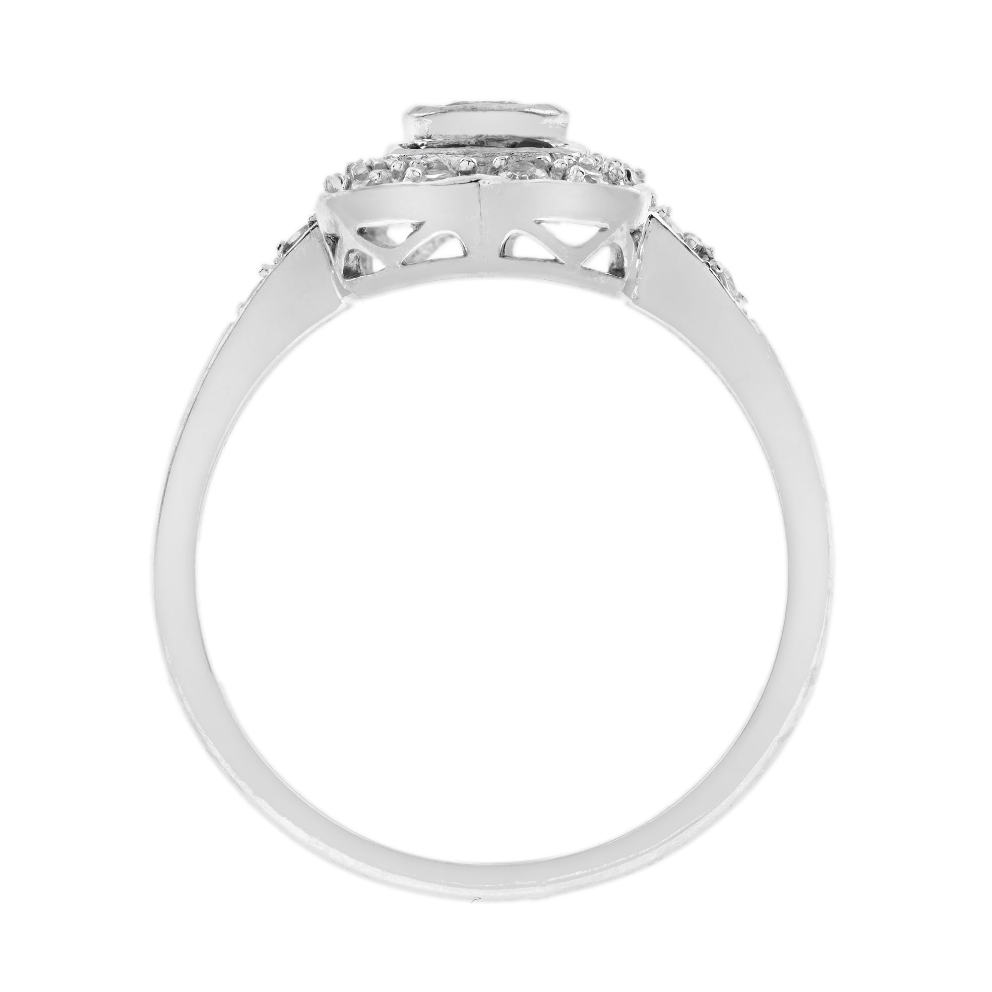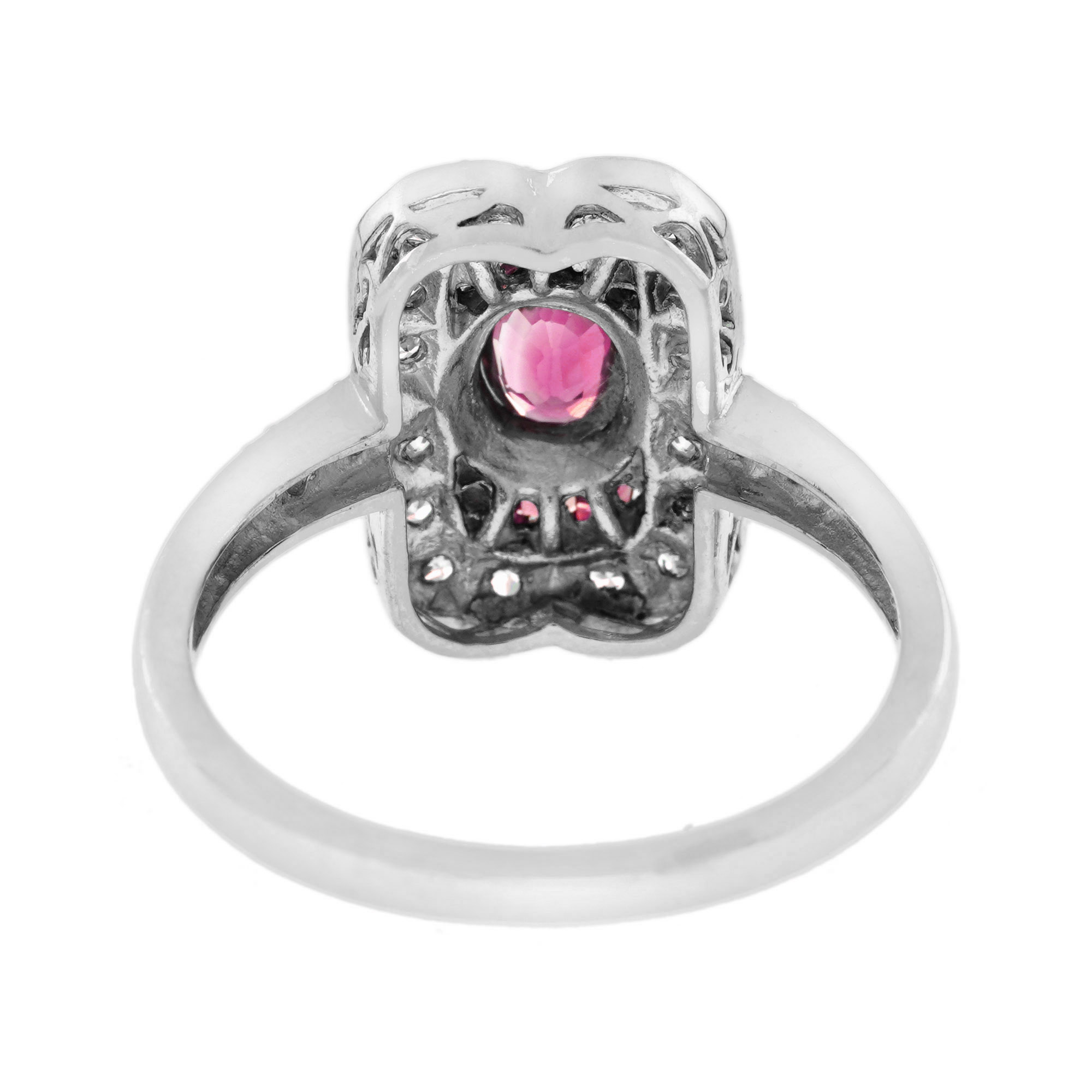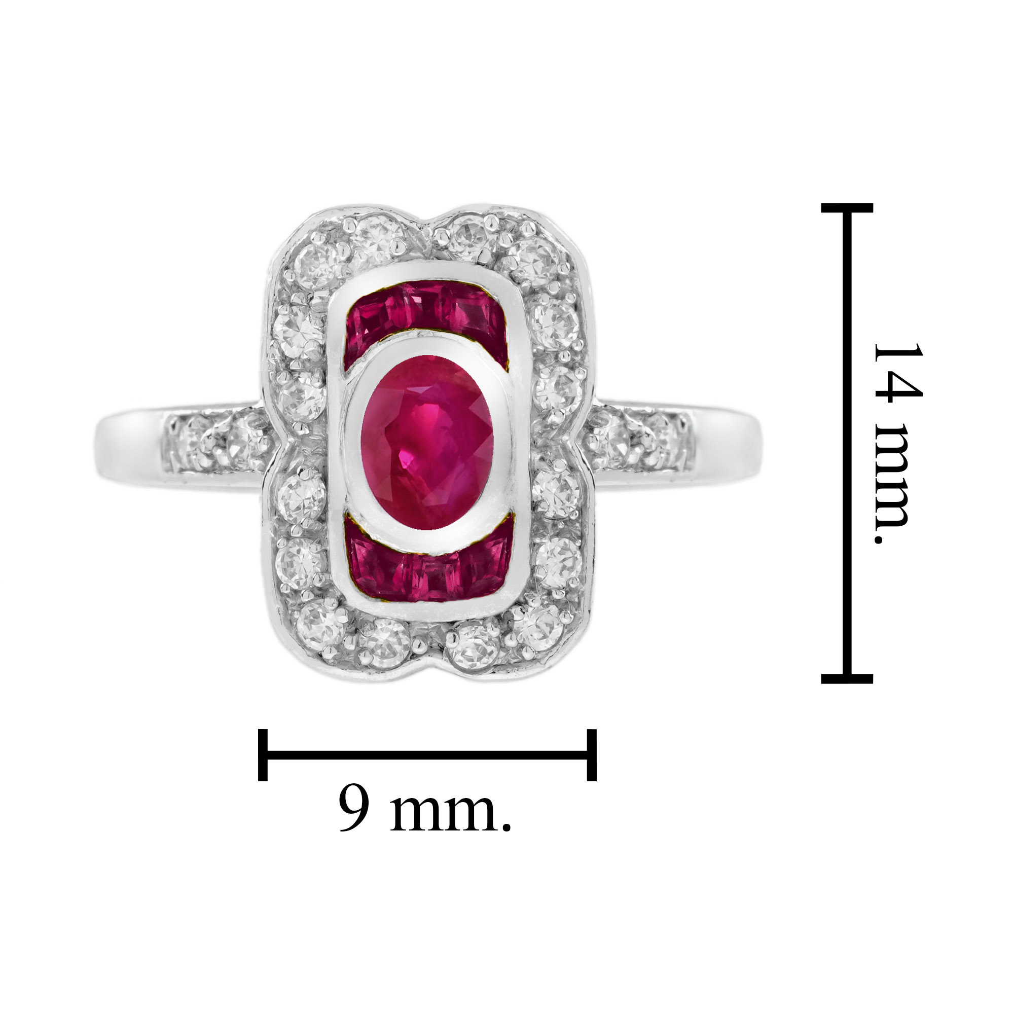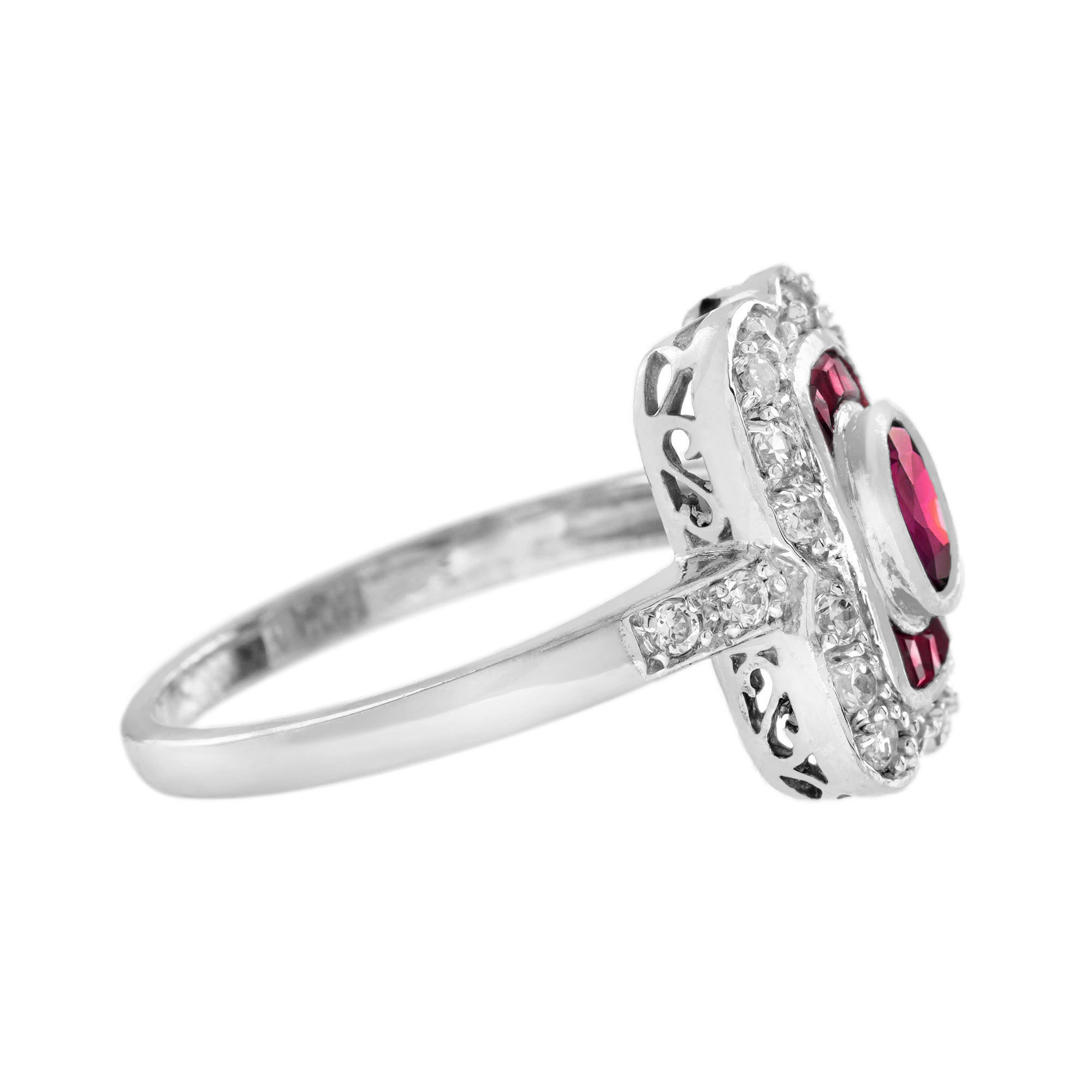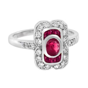An absolutely breathtaking ruby and diamond Art Deco inspired ring, featuring French cut rubies that surrounded a central oval one. The sparkle continues to its edges with round diamonds. This Art Deco inspired ring is a perfect piece for an engagement ring, or to commemorate an anniversary.