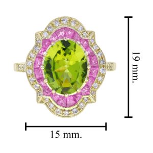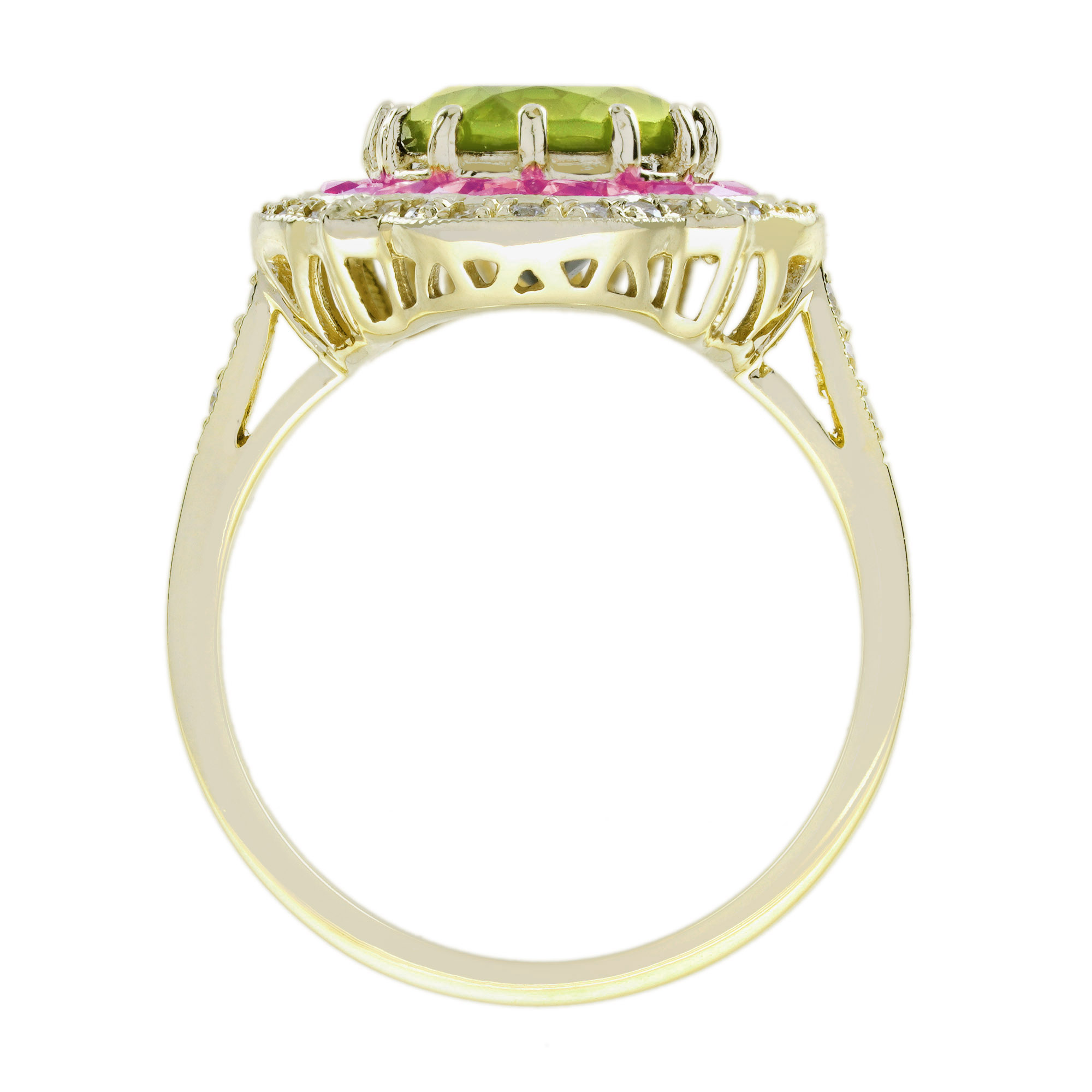 This stunning Art Deco style halo ring showcases a vibrant oval peridot, prong-set to highlight its natural brilliance. Surrounding it are French-cut pink sapphires and a delicate diamond frame, creating a rich contrast of color and sparkle. The intricate halo design adds depth and elegance, capturing the glamour of a bygone era. Each gemstone is carefully selected and masterfully set to ensure exceptional quality. Bold yet feminine, this ring is perfect for collectors of unique fine jewelry.