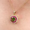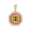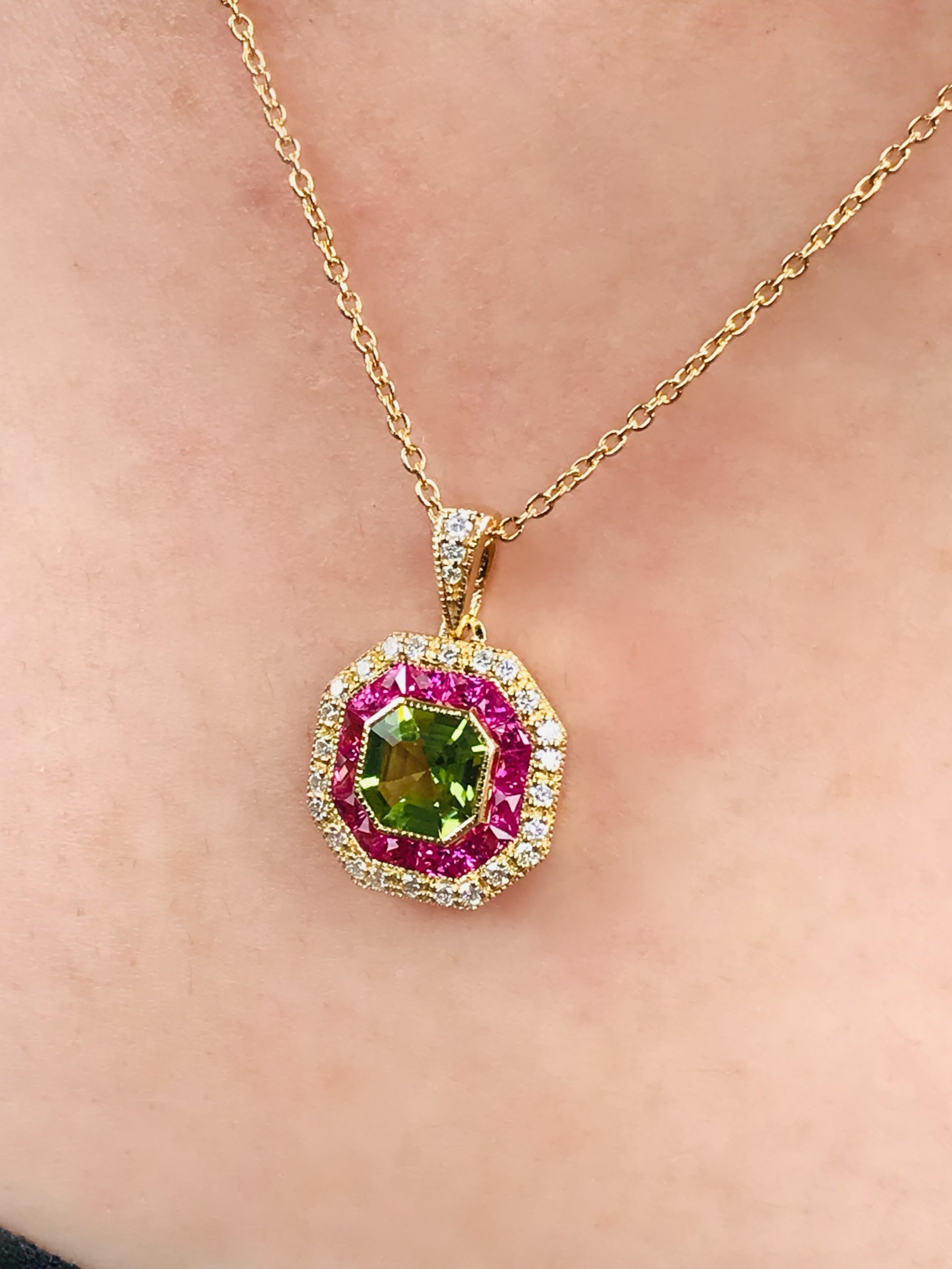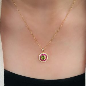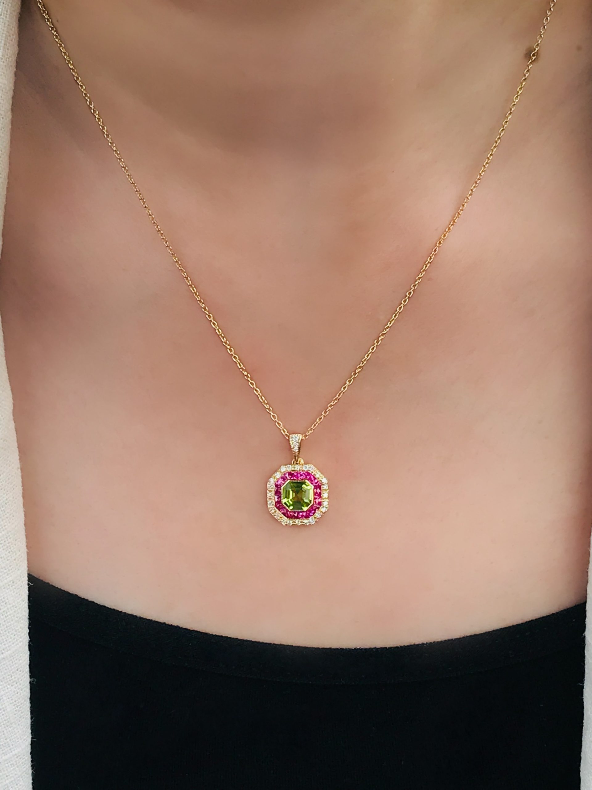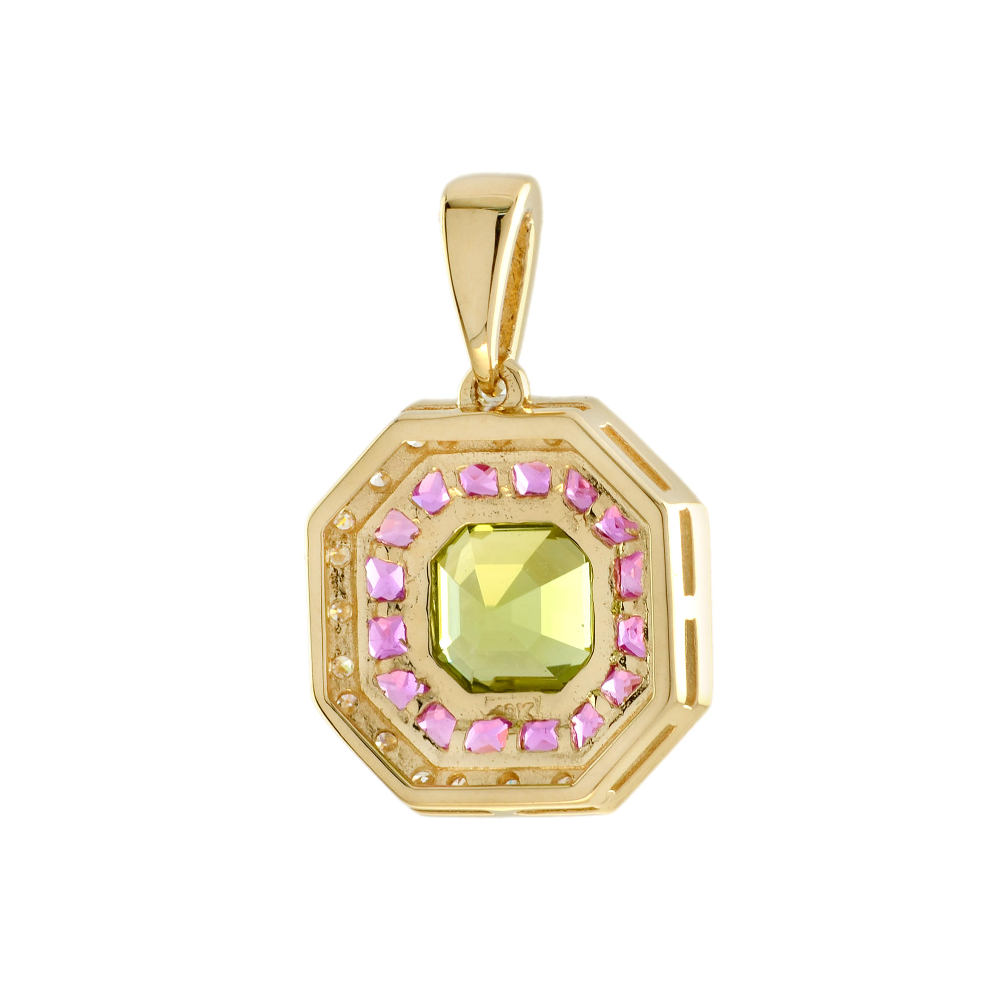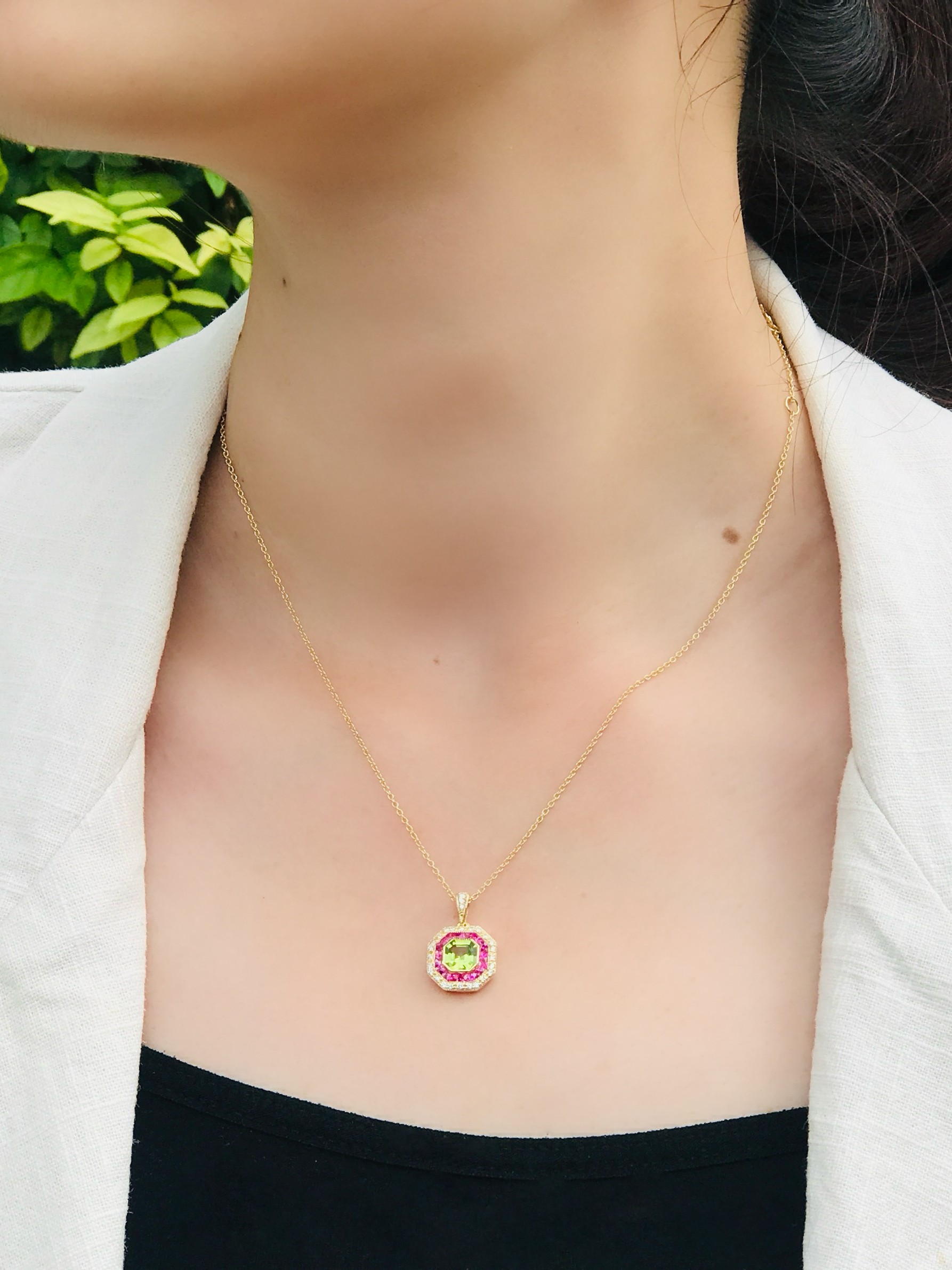 This peridot with pink ruby and diamond pendant presents a stunning example of Art Deco styling and design. Emerald cut apple green color peridot, French cut sweet pink color tone of ruby, and round cut diamond are precisely arranged to create intricate patterns and a remarkable overall appearance.