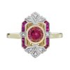 Bold color meets vintage glamour in this striking Art Deco-style engagement ring. At its heart, a vivid ruby glows with passion, surrounded by a sparkling halo of diamonds that add timeless brilliance. Framed with precision-set French-cut emeralds, the rich contrast creates a captivating harmony of red and green. Inspired by the elegance of the 1920s, this ring is a true celebration of bold beauty and refined craftsmanship. A perfect statement piece for those who wear their style with confidence and flair.