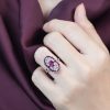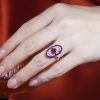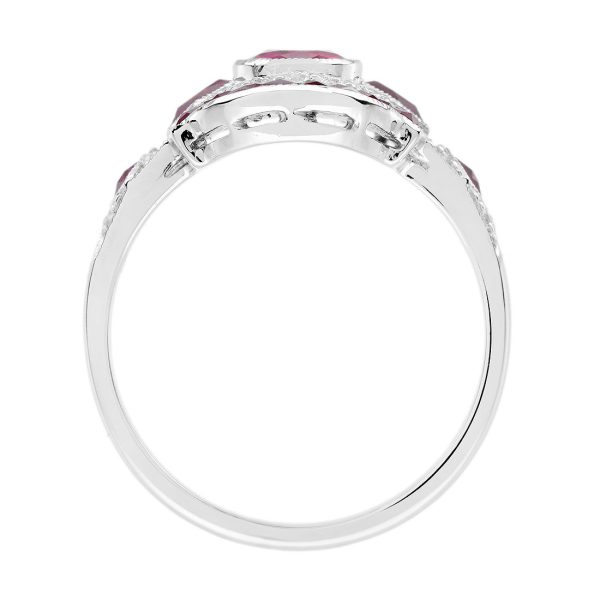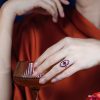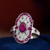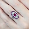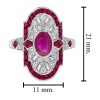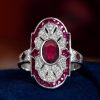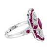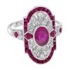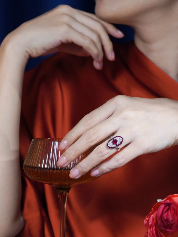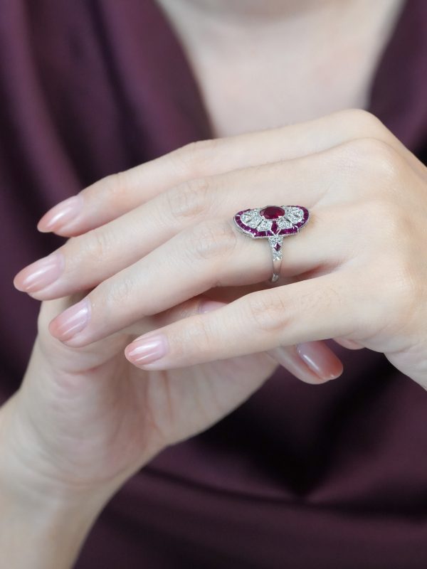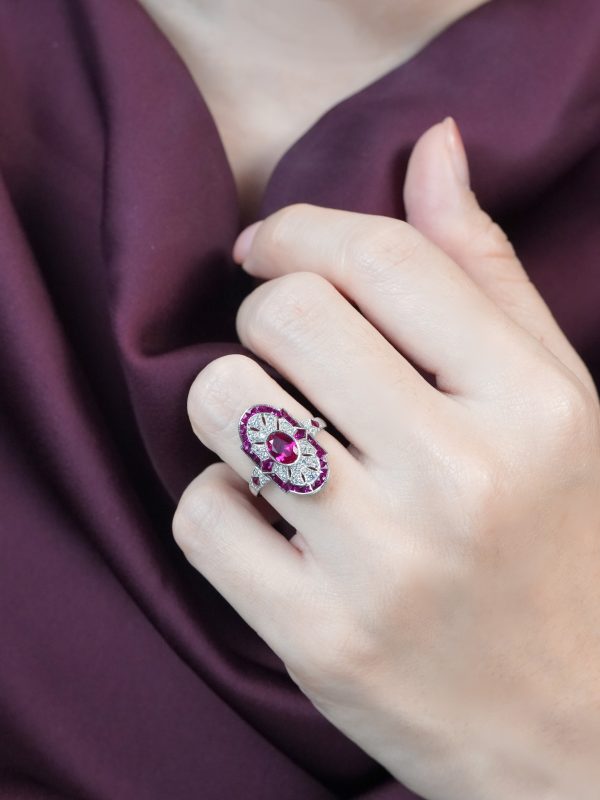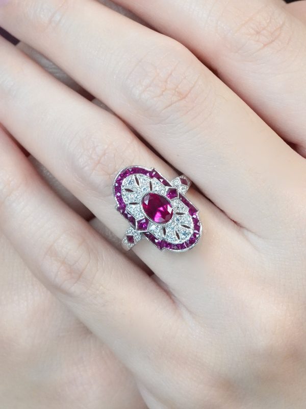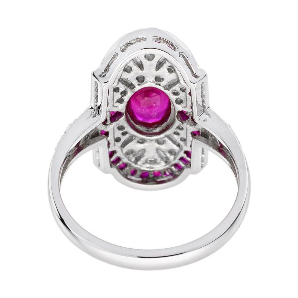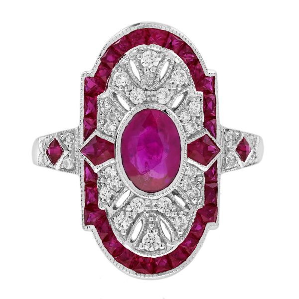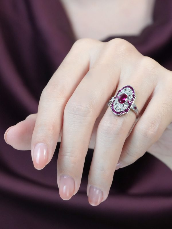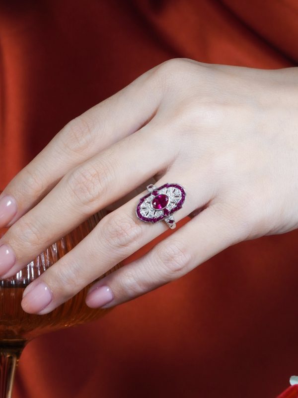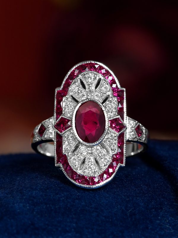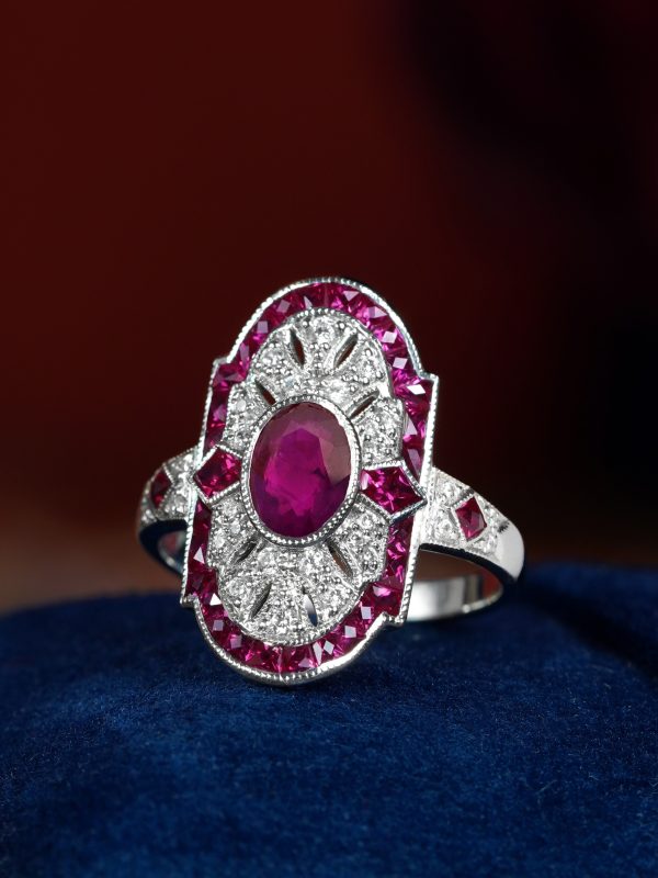 Striking Art Deco–inspired dinner ring featuring an oval-cut ruby at its center, glowing with rich, passionate depth. Encircling the centerpiece, a halo of brilliant diamonds enhances its radiance, while an outer layer of vivid rubies adds bold dimension and intensity. The overall silhouette forms a shield-like shape, evoking strength and timeless elegance. With its layered design and dramatic contrast, this piece captures vintage sophistication with a powerful, regal presence.