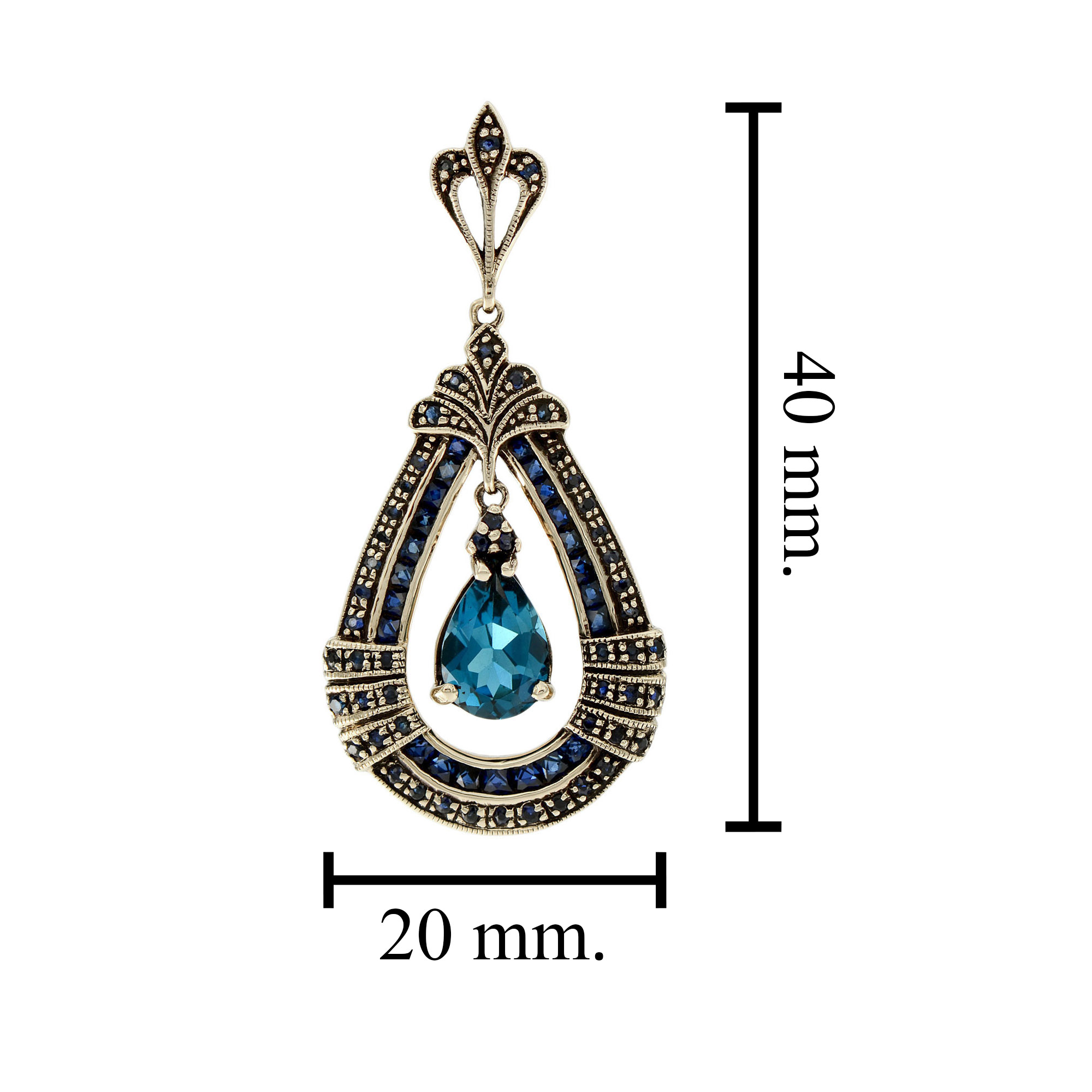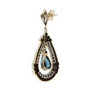 These elegant earrings capture vintage allure with a modern twist. A radiant sapphire, prong-set at the center, dances gracefully with every move. Surrounding French-cut sapphires trace a delicate drop silhouette, shimmering with timeless charm. Accented by sparkling diamonds, they whisper sophistication in every detail. Perfect for those who adore classic beauty with a touch of romance.
