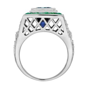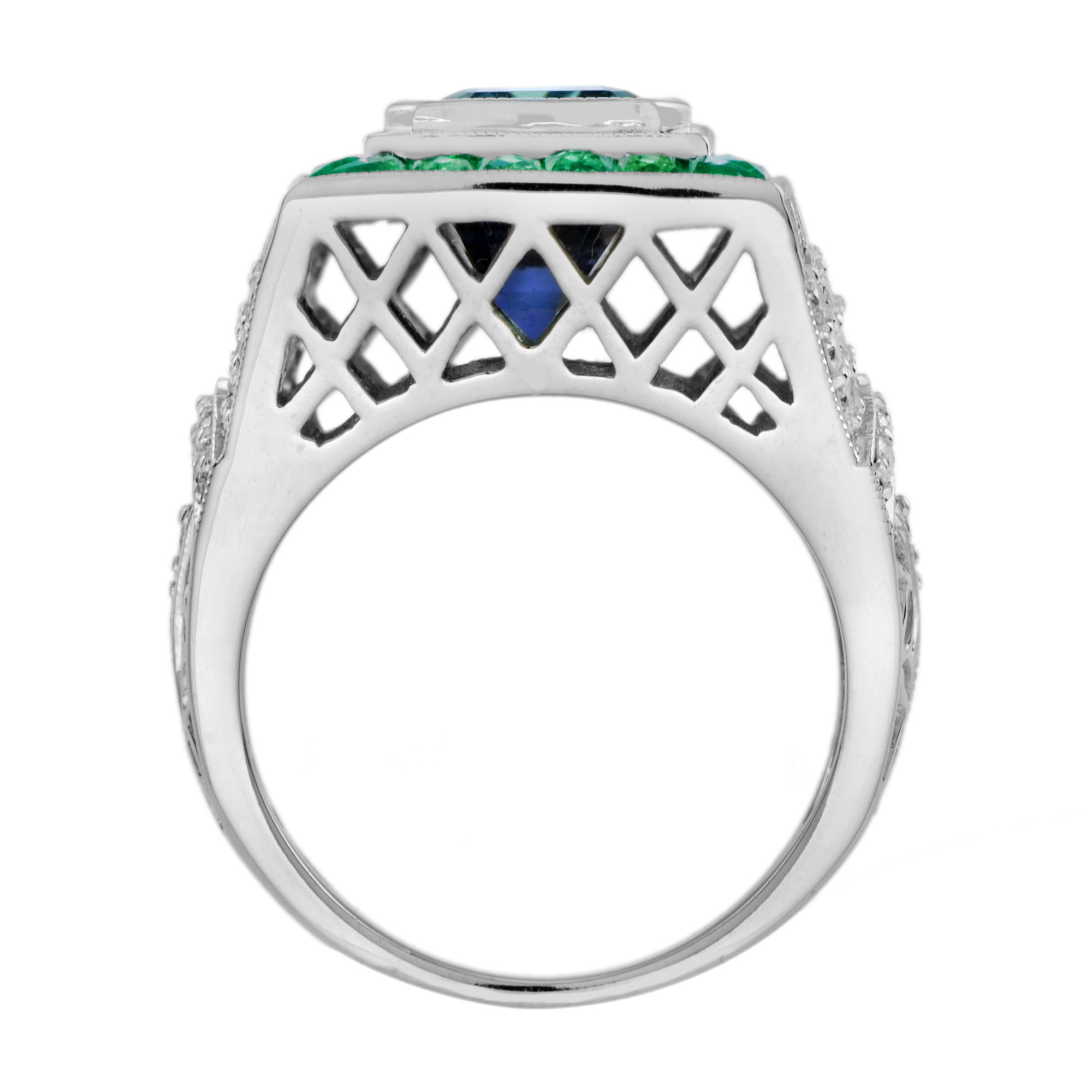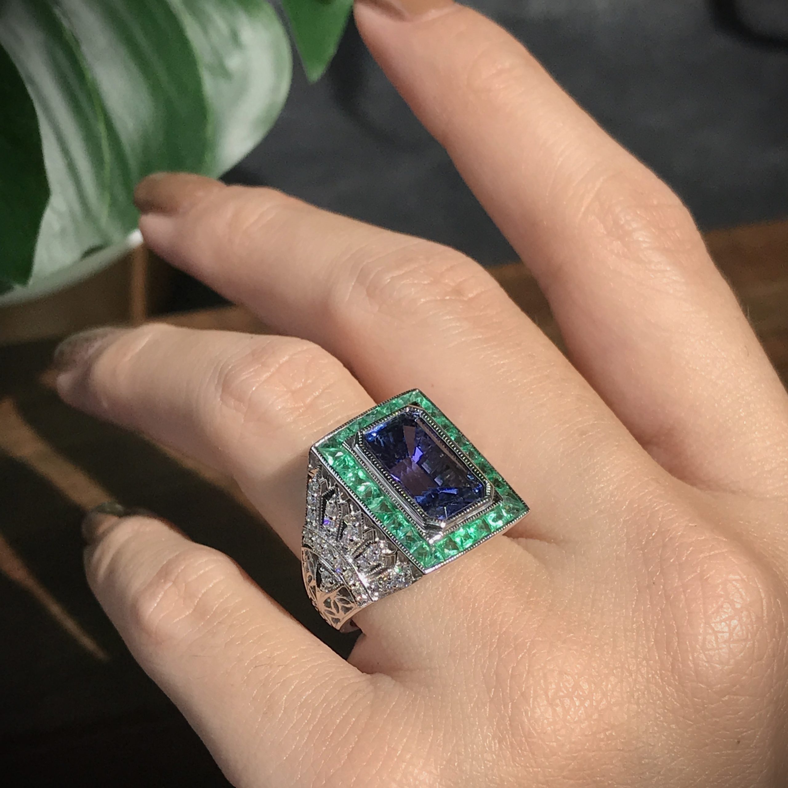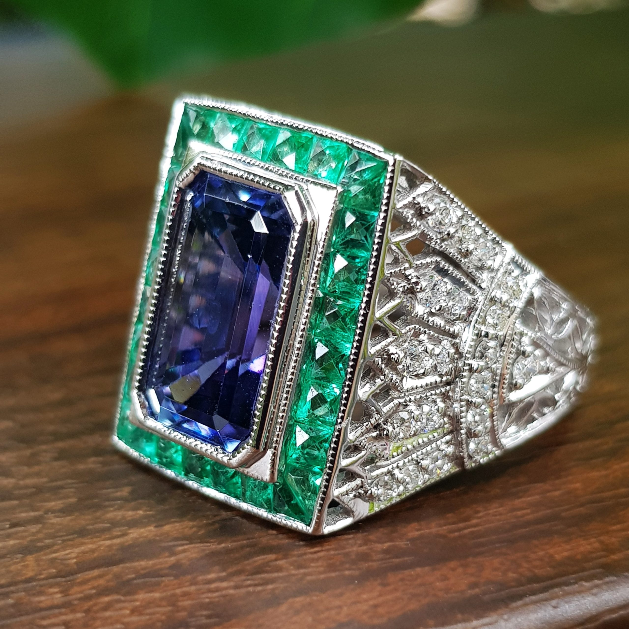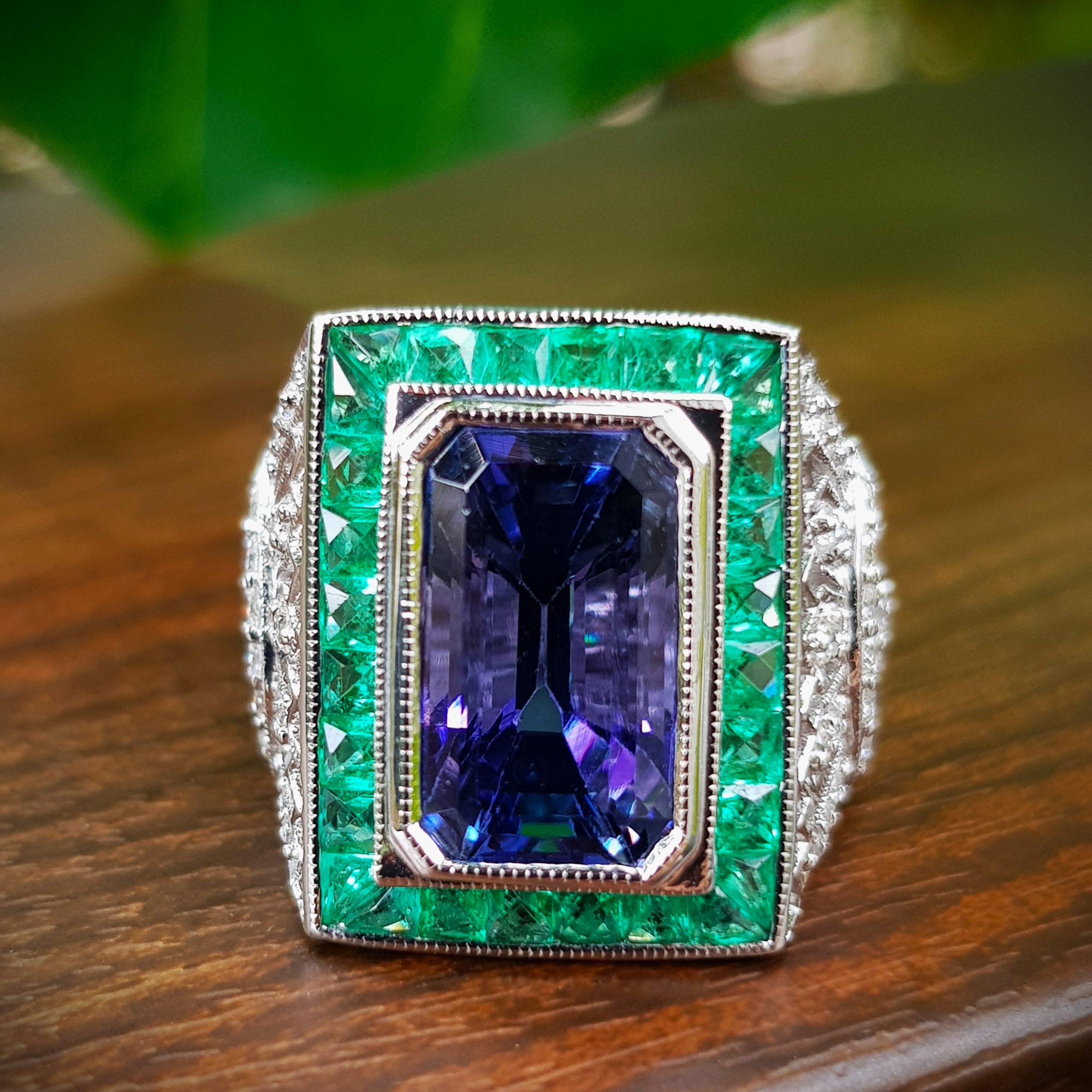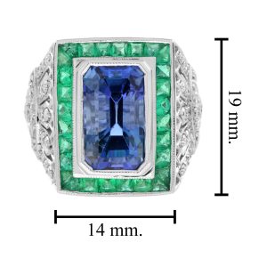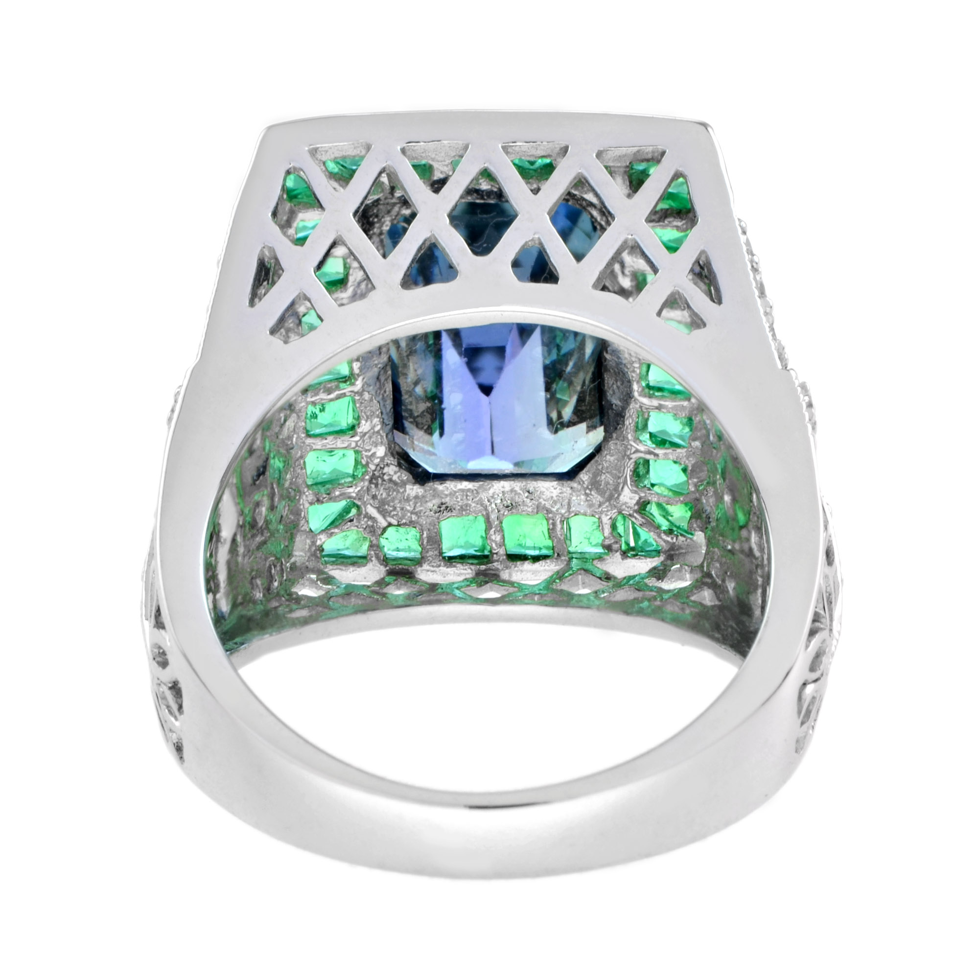 You’ll be delighted to wear this splendid one-of-a-kind Art Deco inspired ring. Crafted in 18K white gold, the ring features the center 6.10 carats emerald cut tanzanite wrapped in an halo of emeralds. An outer square frame has milgrain-detailed while rows of diamonds and milgrain detailing glisten along the multi-row shank.
