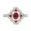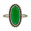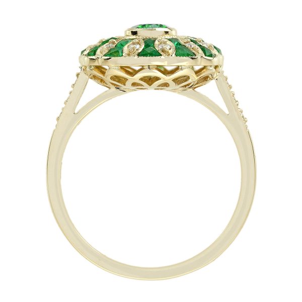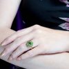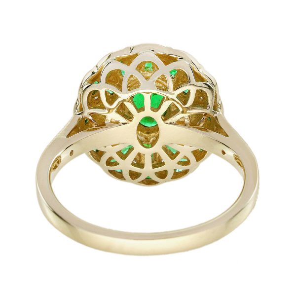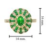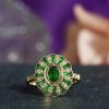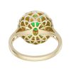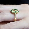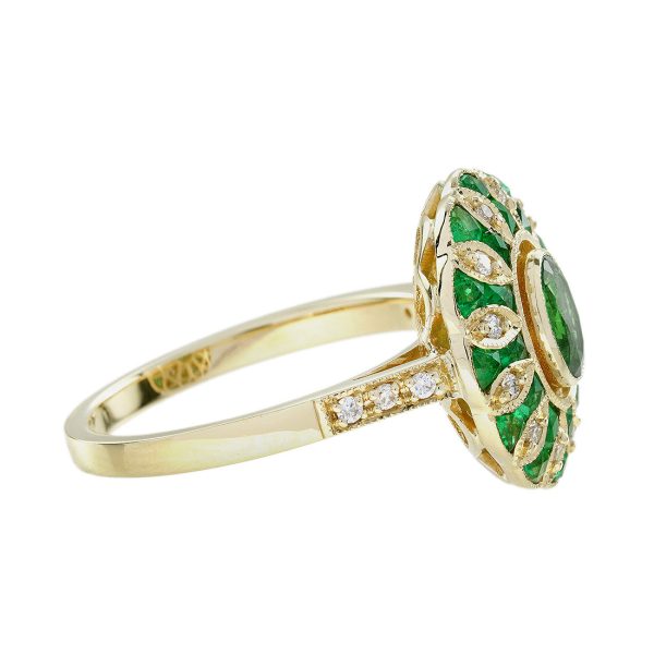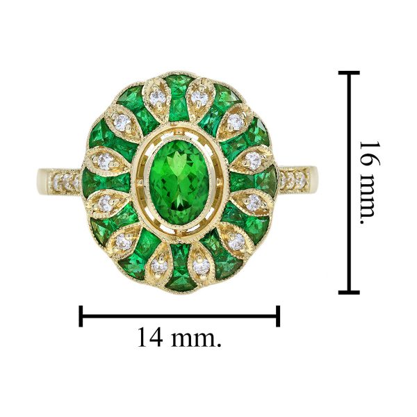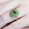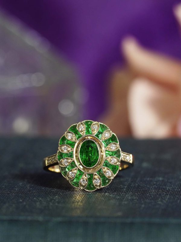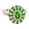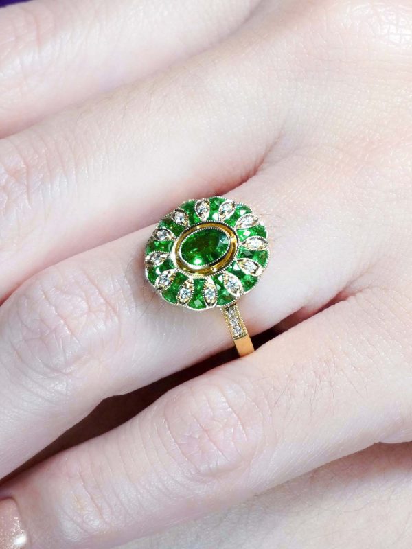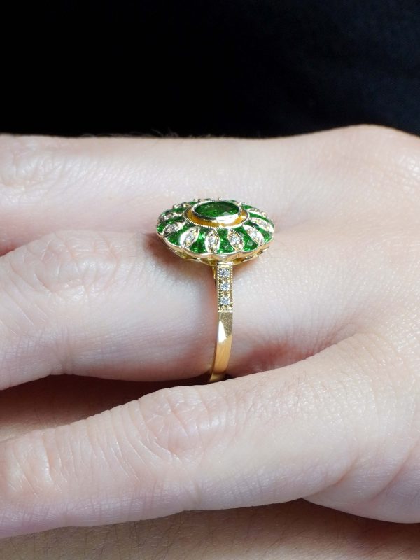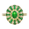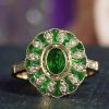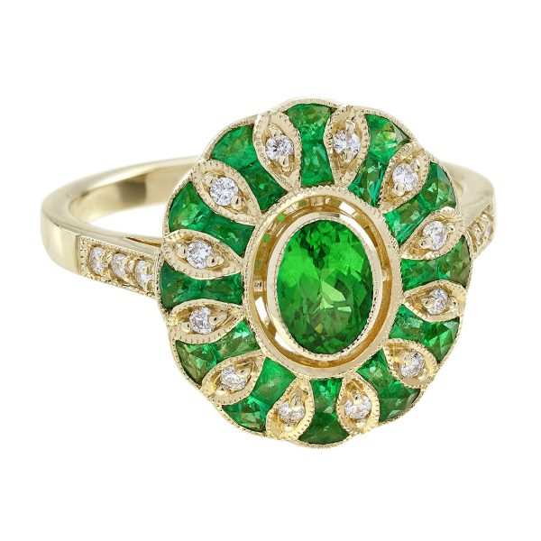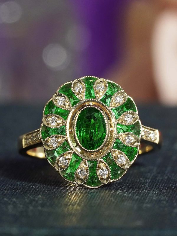 A vintage-style ring centered with a vibrant tsavorite, framed by a matching outer halo of tsavorite for rich depth and color. Surrounding the outer edge, diamonds are arranged like a delicate petal flower, adding radiant sparkle and romantic detail. Three additional diamonds accent each side of the band, enhancing balance and brilliance. Creative and elegant, this ring captures timeless beauty with a graceful, floral-inspired charm.