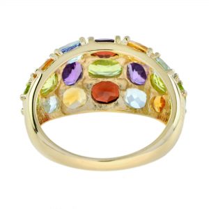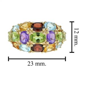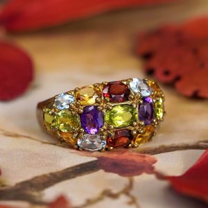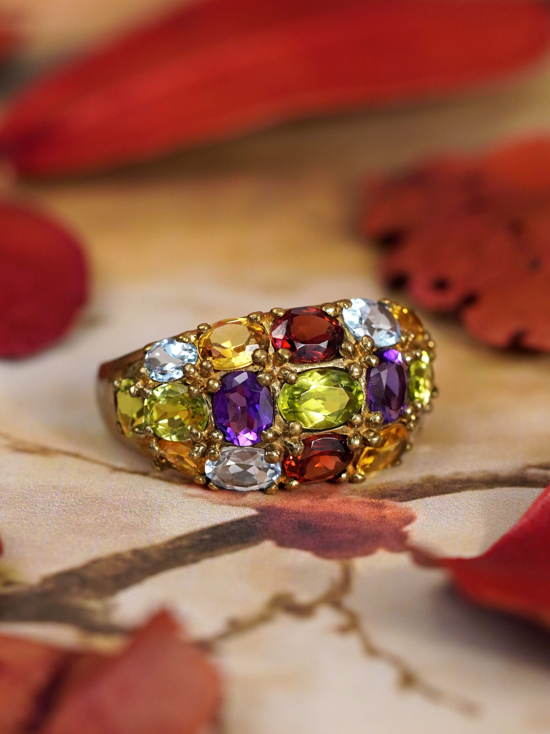 vibrant natural gemstones, expertly set to create a dazzling display of color. Its vintage-inspired design features intricate detailing that adds timeless charm. Perfect for making a bold statement at any event. Adds elegance and sparkle to both special occasions and everyday wear. A true standout piece for your jewelry collection.