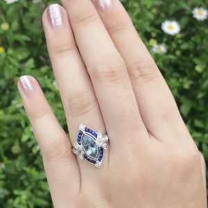 Aquamarine Diamond and Blue Sapphire Art Deco Style Engagement Ring
